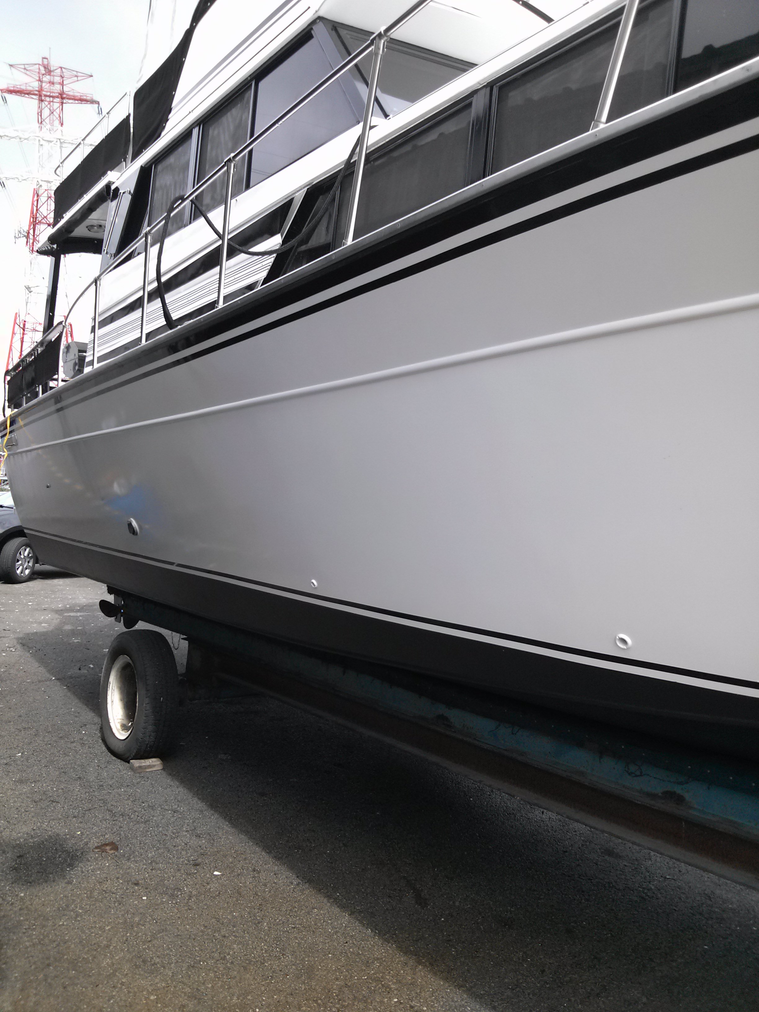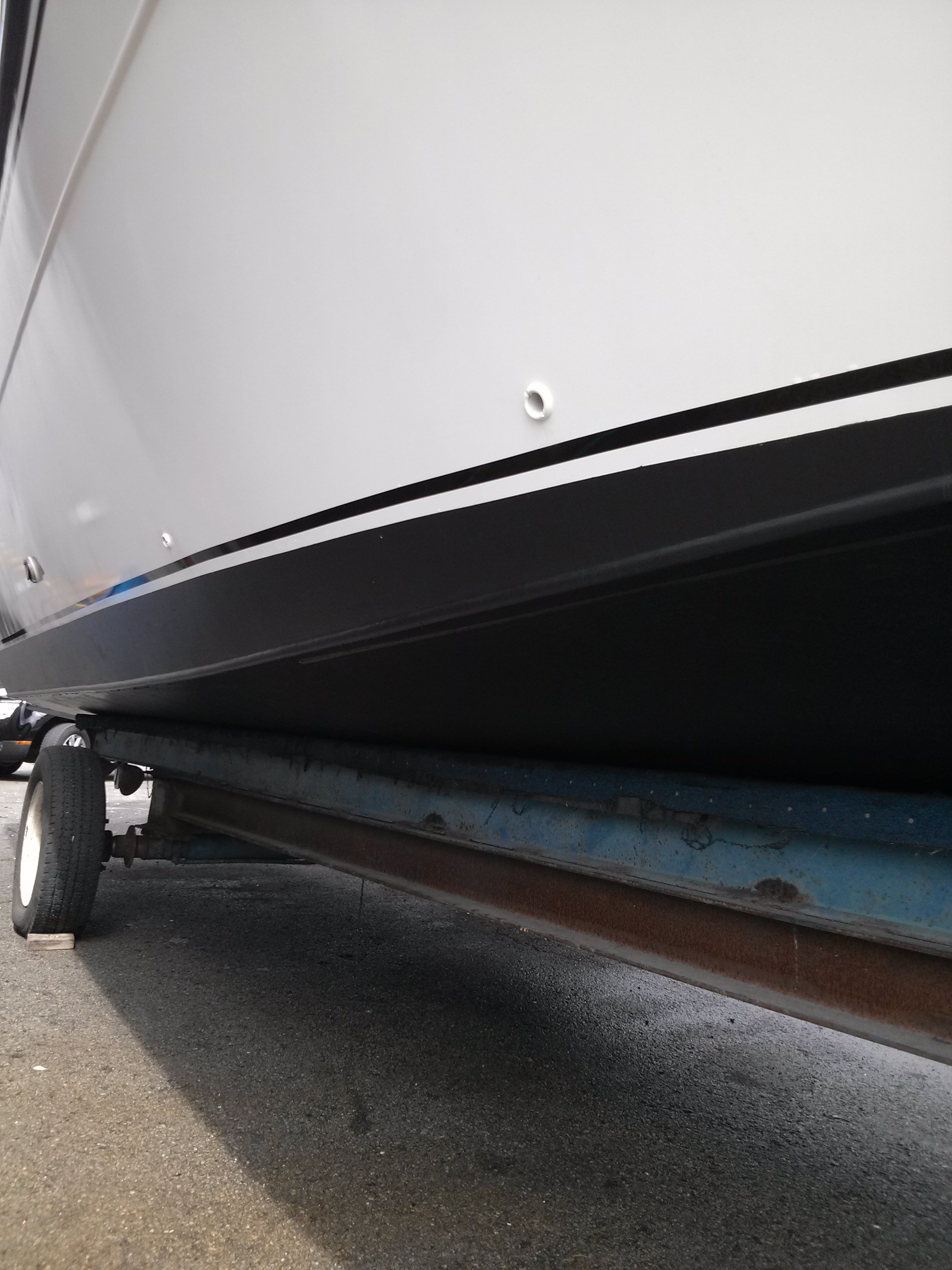Still looks good, holding up well, Gloss White for the hull, Navy Blue for the stripe. Used 3/4" reflective white tape for the pinstripe. Have yet to finish the rest, between work and the weather just can't seem to "Get er Done".
