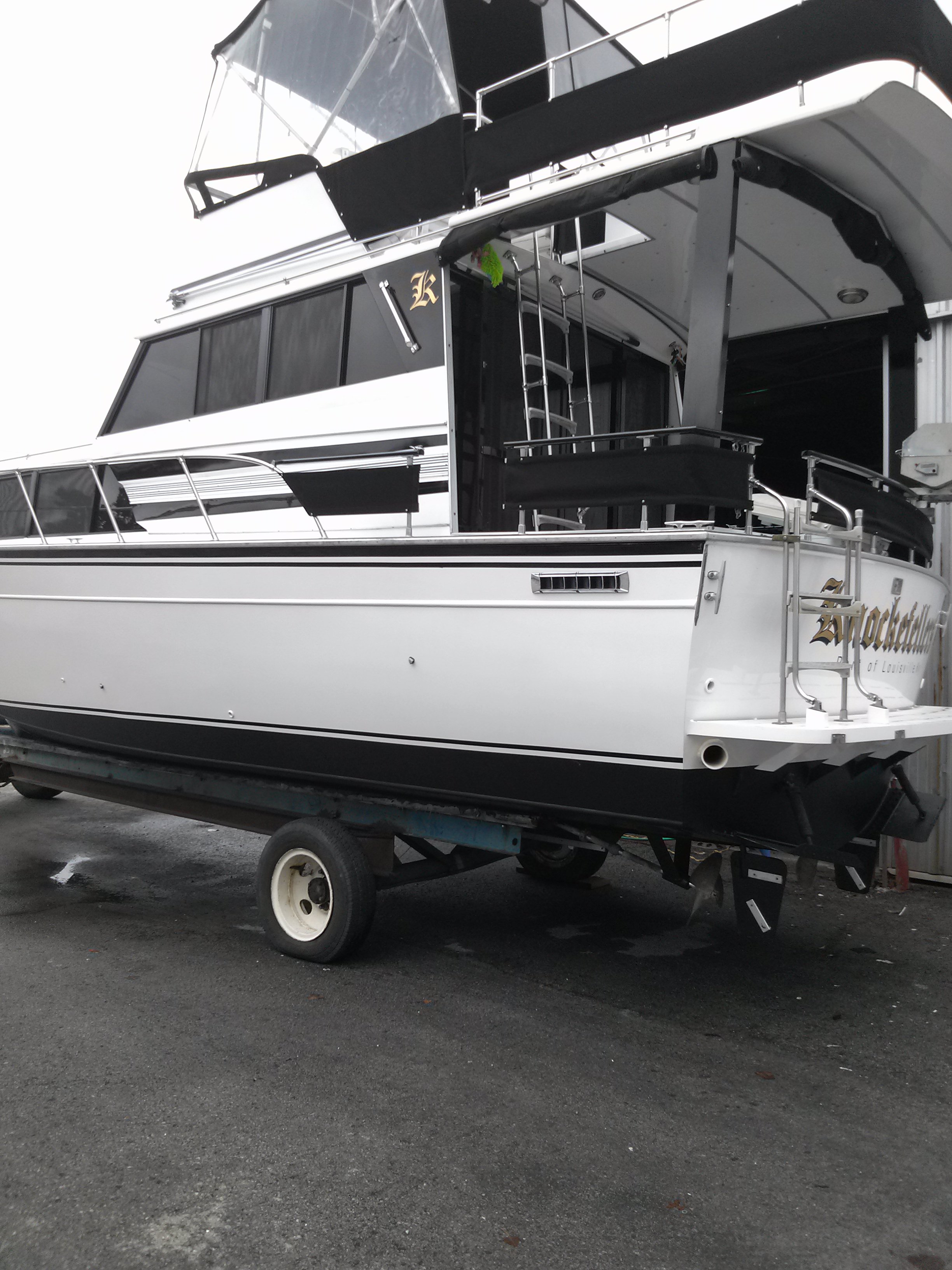 1988 sedan flybridge. Black / White. 318 240 hp Aluminum aft deck hard top. Louisville Ky . Tartans landing. " KNOCKEFELLERS"