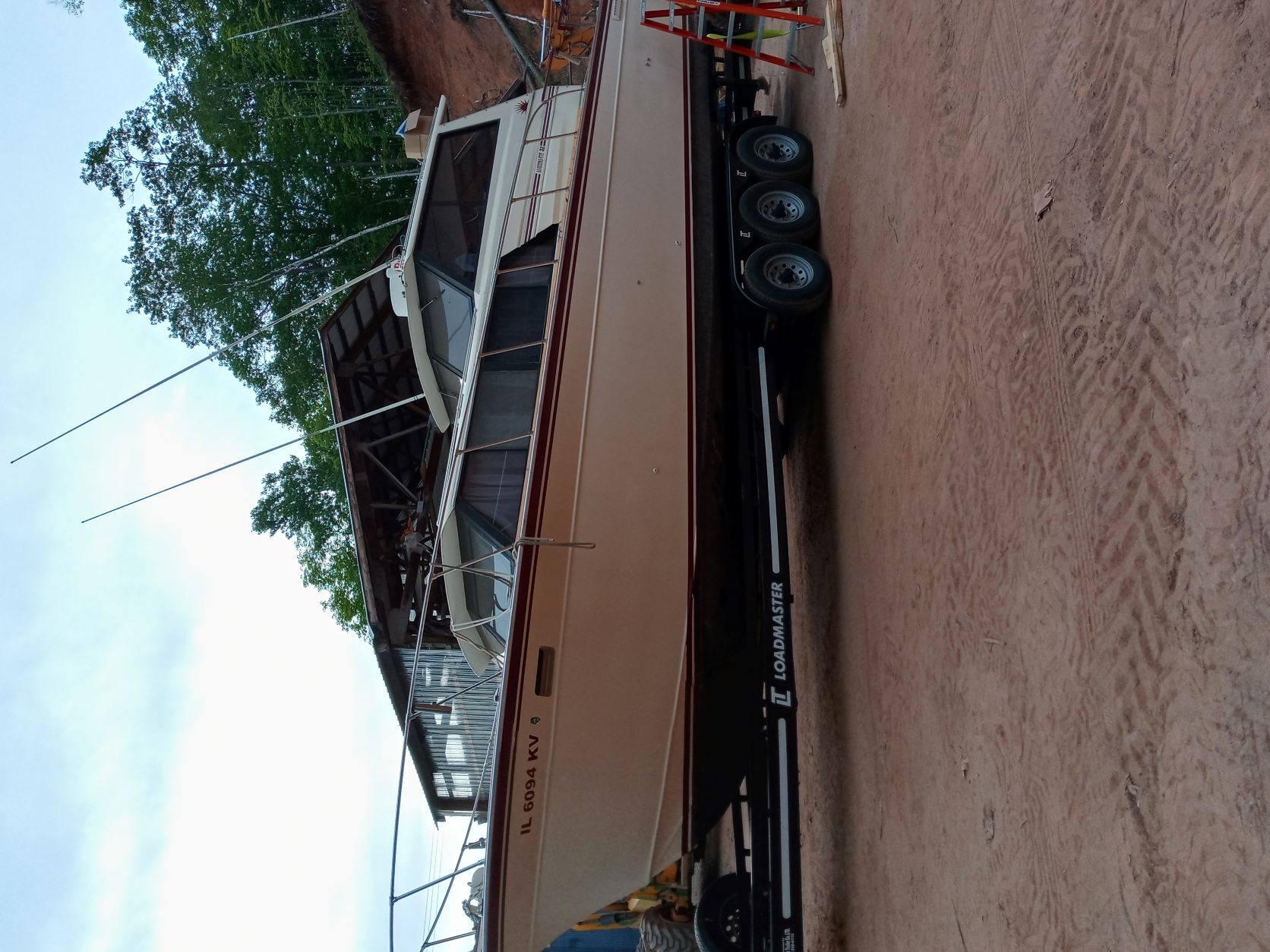 Swapped trailers under boat. Borrowed a buddies trailer for it to sit on after the engines go in. Old trailer was too short and did not support the stern at all. We used a fork lift, loader and a couple tow straps to and it for the swap.