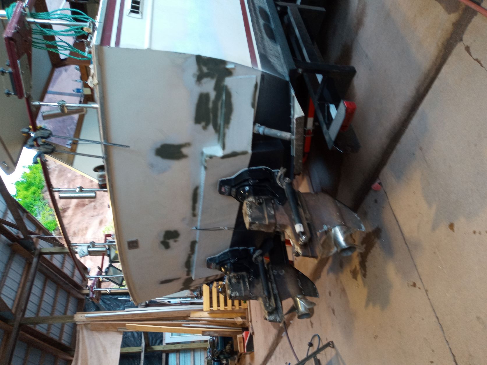 Engines mounted, transom assemblies installed, engines aligned, outdrives installed. Slapped some primer on the bare metal.