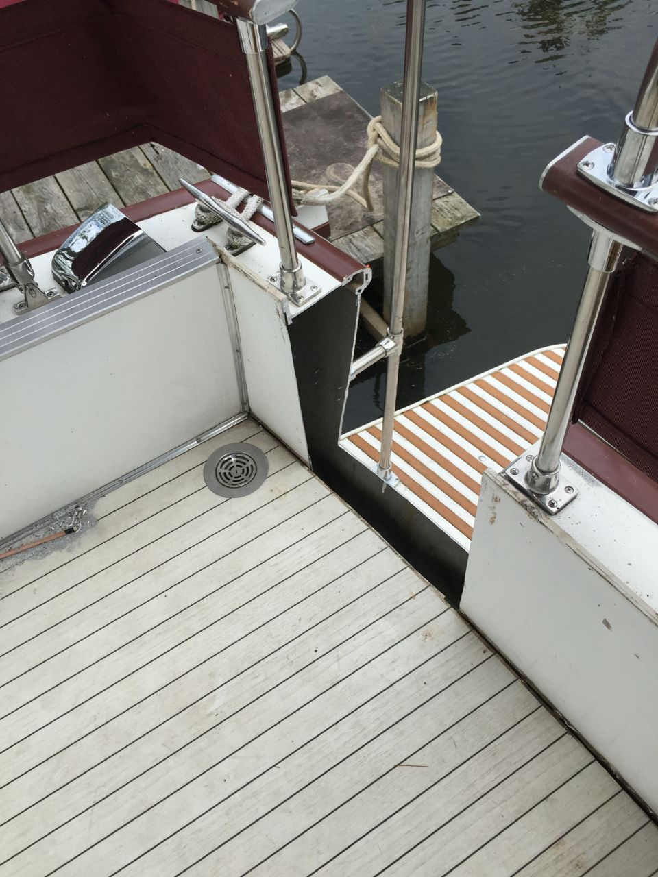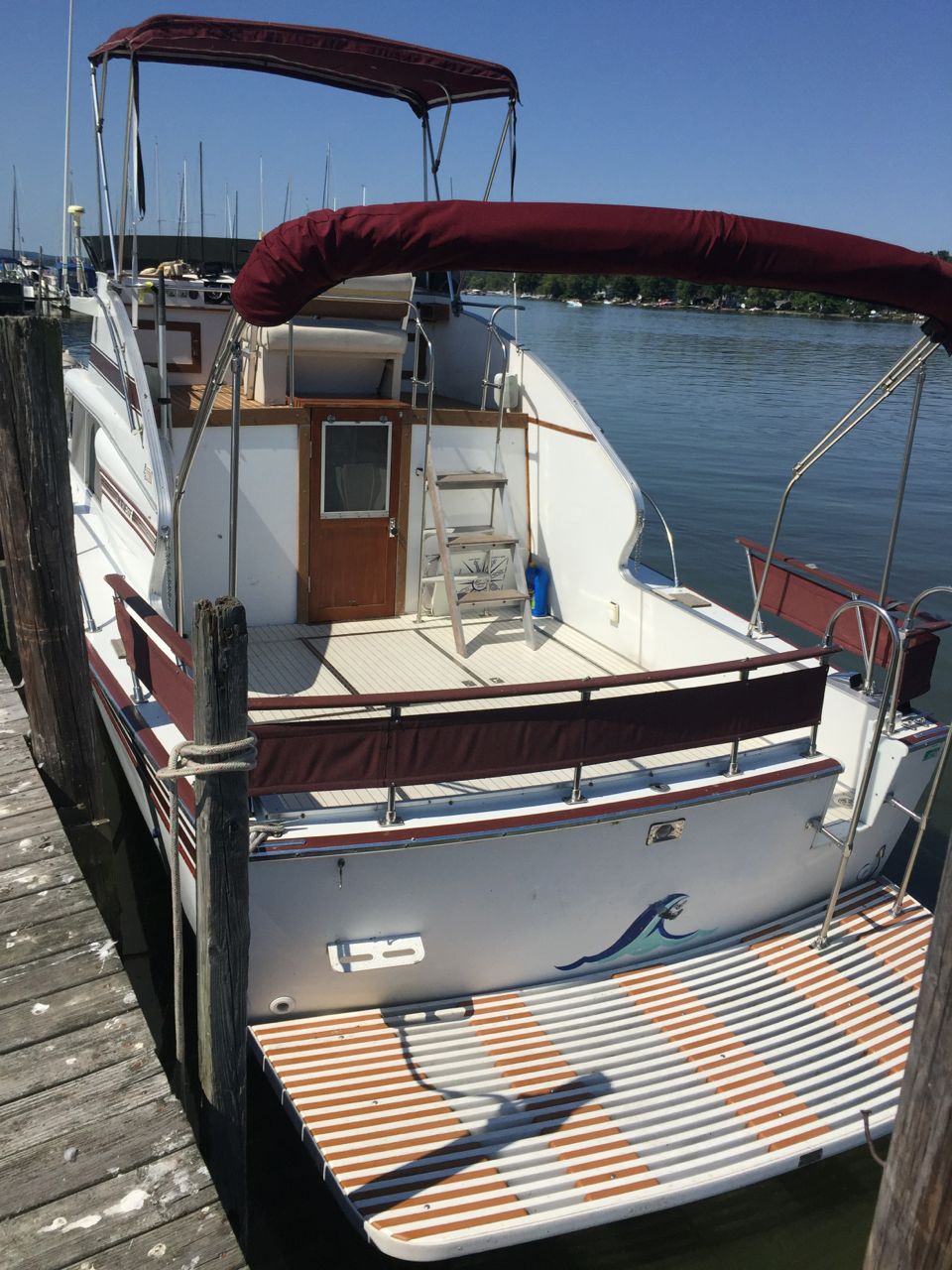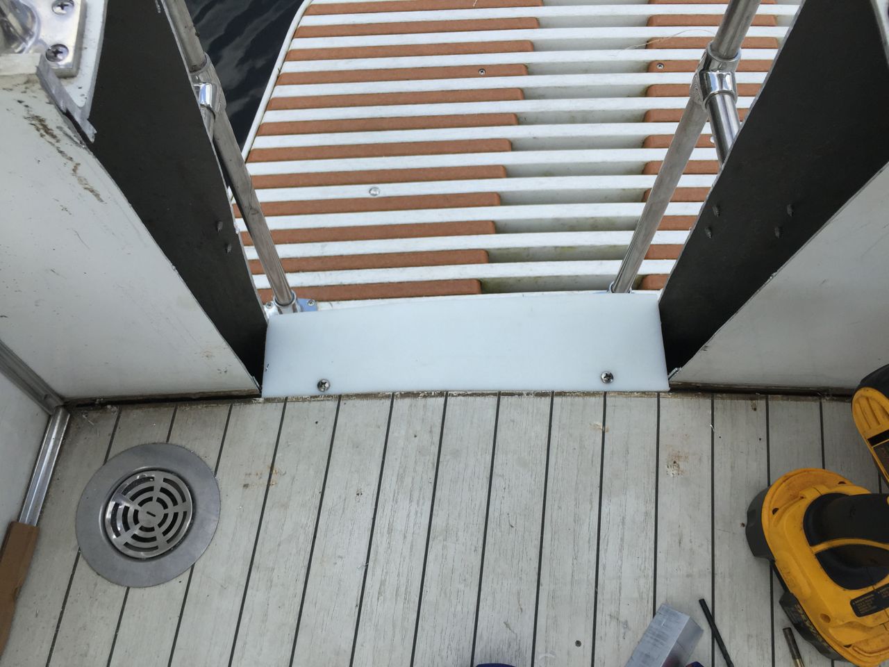 The boat is a 1982 28' Sportsfisherman with twin V6 165 HP Crusaders. It is used for day outings with the family and fishing. I wanted better access to the water and lifting little kids and a yellow lab over the railing got old real fast so I came up with a solution. Cut a gate, add railings and larger swim platform. The swim platform was made by plasTEAK outside Akron, OH. It is made of recycled plastic. I made a cardboard template off the old short platform and simply extended it and sent them the form. It is aprox. 101.5 in. by 34 in. They have different colors to match your boat. https://www.plasteak.com. (I also used their sister company products for the flybridge deck and cabin sole. PlasDECK.com) The cost was $1380.00 and $245 for the under mount stainless ladder. I hired a local welder to remove the old platform and build braces similar to the original structure but with longer angle braces. The ladder and transom gate was added later. First the ladder with a temporary step. I bought the railing and hardware on line and a local machine shop made the bends. It was then just a matter of cutting the railing to length and mounting the hardware. The gate was also rather easy once I made sure all the cuts were aligned correctly. First I cut the inner panel, using a T square to make sure the cuts were vertical. Then again using the right angle guide to make sure the outside cuts were parallel to the inner ones. Drill a hole in the lower corners and I used a battery powered DeWalt Sawzall. I then sealed off the gap with high density 1/2 plastic boarding. Similar to a plastic cutting board, but any material would do. I used some 3/4 inch aluminum angle stock to mount the plastic. I was thinking about replacing the plastic with aluminum to keep with the Marinette theme. I have some of the board left and have some stainless hinges to make a gate but.....now it's boating season and I don't want to work on it with a drink in my hand!