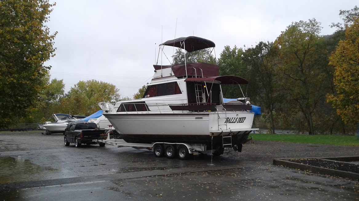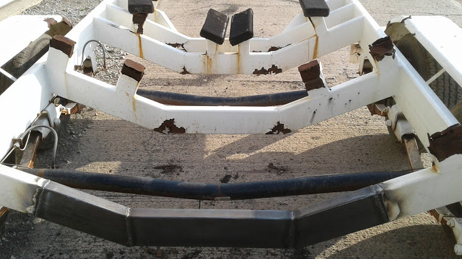 The bunks are if I remember right are 6' apart. I know the struts are pretty close, but I believe I have to much tongue weight. Next year I'm going to shift it back about 6" or so. That would put my struts 8" from the bunks as well. I set this trailer up all with only 1 measurement the outside strut bolts from inside the boat. That was around 5'8" the one thing I didn't know the bow sits way lower than the stern (barely fits). The bunks are 2x6x10 I was trying to keep it low as to trailer it a short distance without taking off the bridge(didn't work sits around 15'). I can try and get some better measurements for ya next time I head to the yard. If your just going to use a trailer for the yard a twin axle will do just fine. The trailer I found is to long and its rated for 18,000lbs. The trailer alone weights around 4,000lbs. I wanted the option to be able to travel street legal.